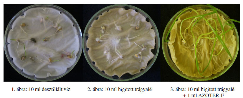 Kísérletünk a Trichodermák növénynövekedésre gyakorolt hatását szemléltetik: Petri-csészéket desztillált vízzel (1. ábra), hígított trágyalével (2. ábra), illetve Trichoderma atroviride gombát tartalmazó AZOTER-F készítménnyel kiegészített trágyalével (3. ábra) kezeltük, majd 10-10 db búzaszemet helyeztünk a vatta felszínére. Egy hét elteltével a legintenzívebb csíranövény-fejlődést a Trichoderma-tartalmú készítmény alkalmazása esetén tapasztaltuk (3. ábra).